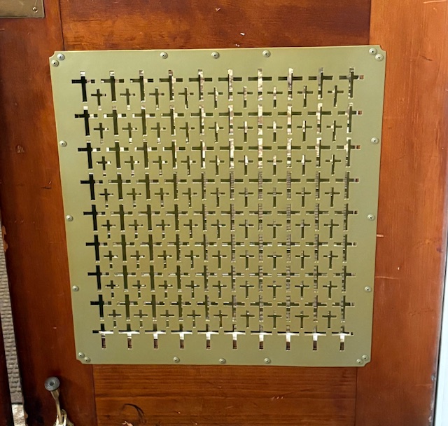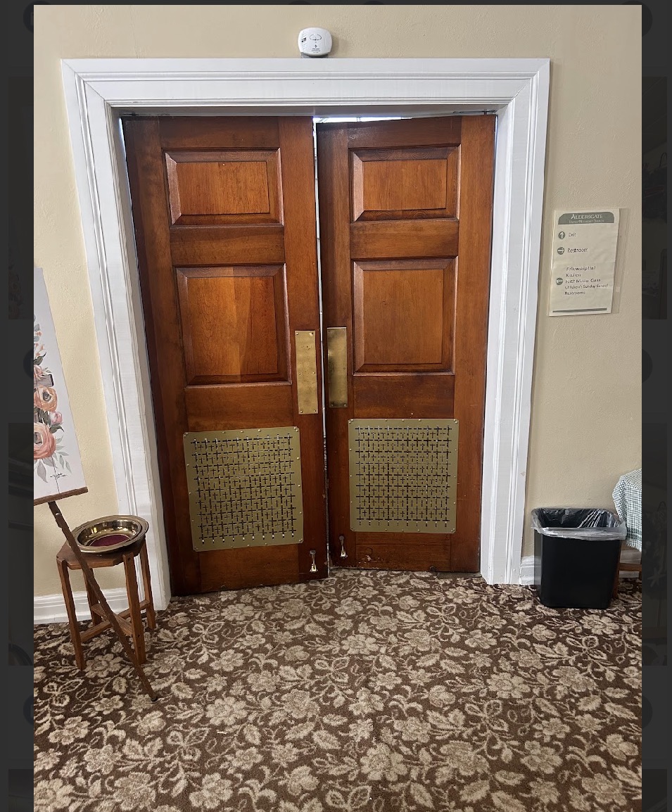 One of the most thoughtful parts of this installation was the return air strategy. MGM Mechanical used the front vestibule as the return path and modified the swinging doors with custom decorative transfer grilles. Air is pulled from the sanctuary through those transfer grilles and into return grilles placed in the vestibule ceiling.